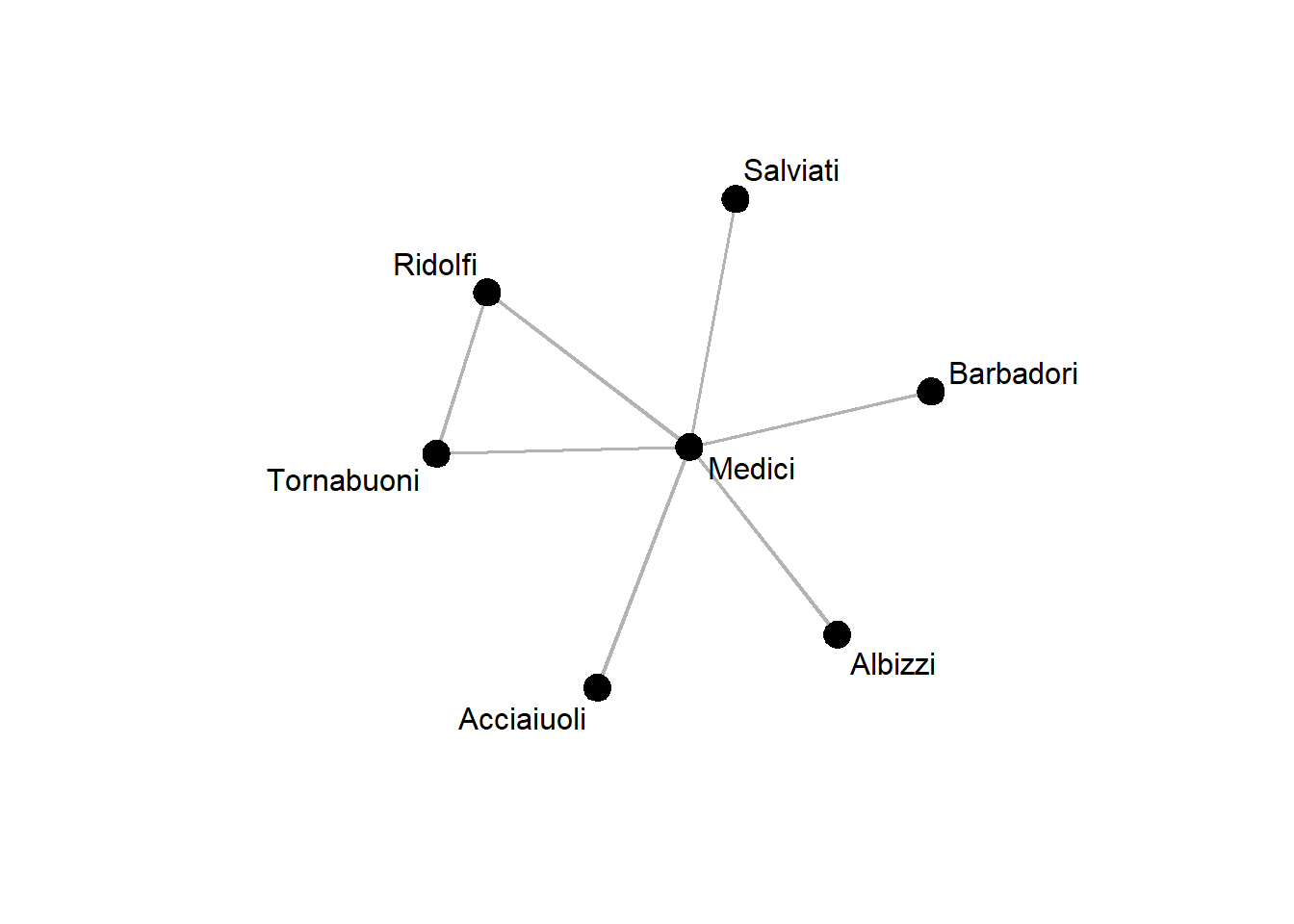 ego_medici <- network(ego_medici[["Medici"]], directed=FALSE)Looking at the Medici’s ego-network, we can see that only a single pair of their alteri is connected:
