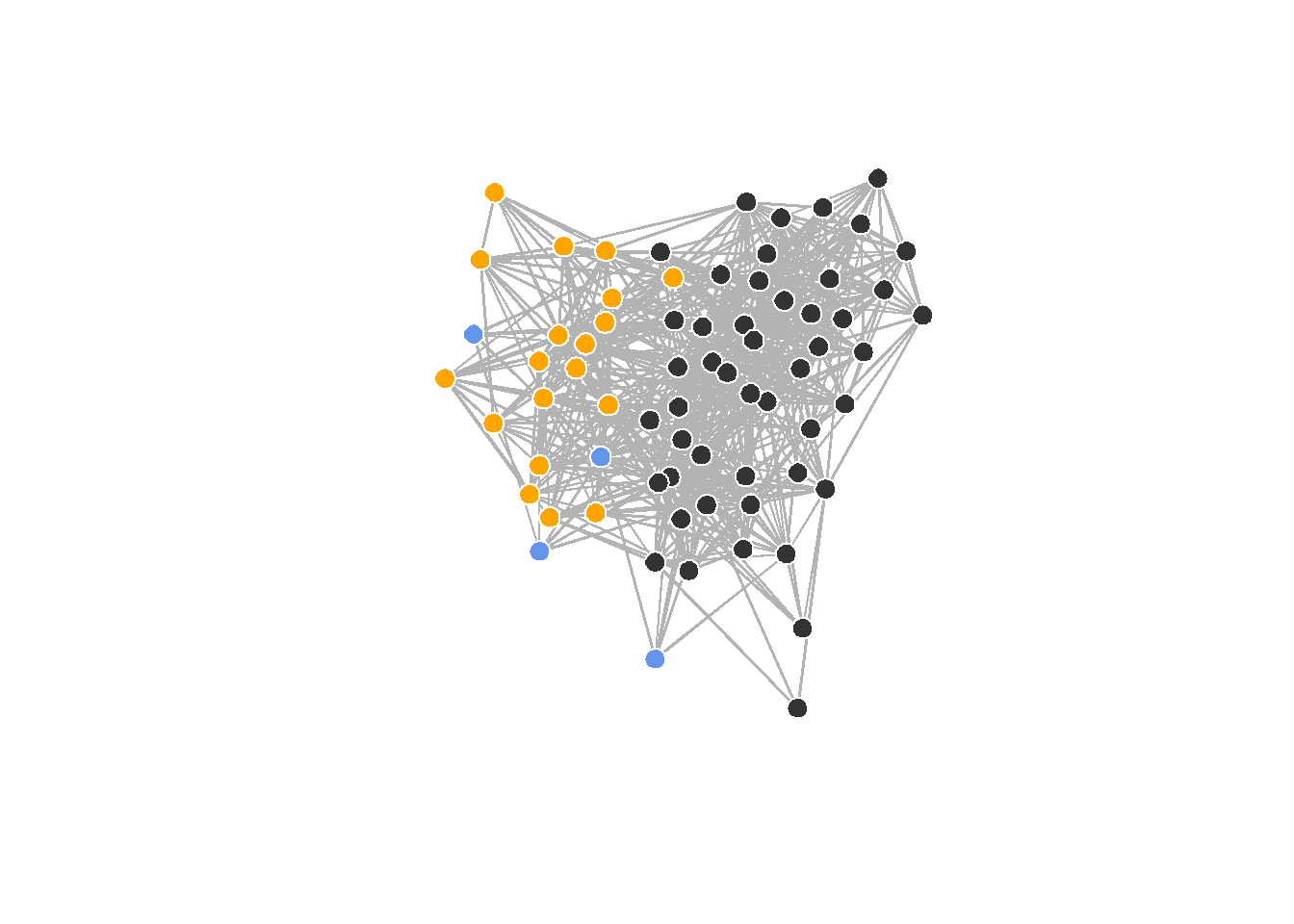 attrib <- read.csv2("data/lazega_attrib.csv")We are now ready to plot the network with node colors indicating office affiliation: