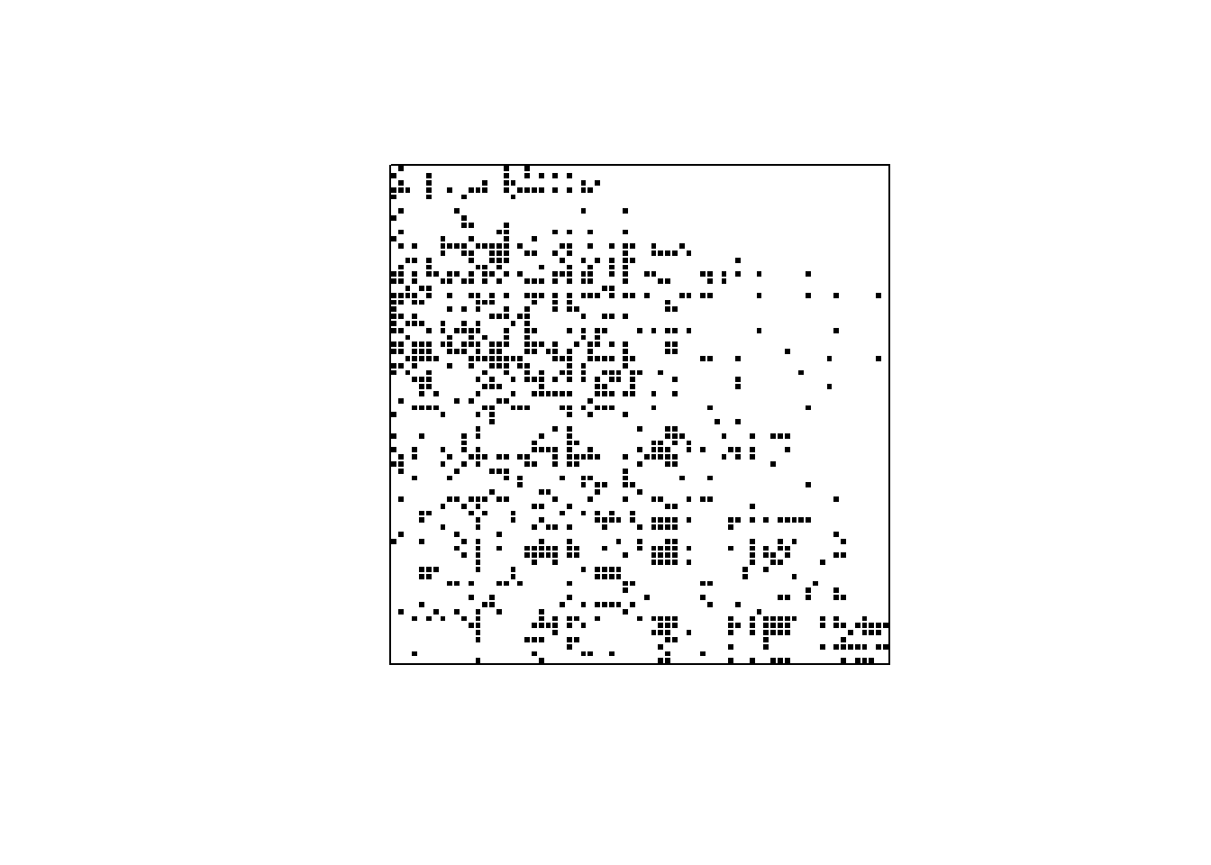 Instead of the ‘spaghetti plot’, we can plot the adjacency matrix of the network directly by coloring cells with a realized edge black and leaving the others empty. This is achieved with the plot.sociomatrix(...) function, which has a range of keywords to control whether to draw matrix gridlines and labels. We also pass asp=1 to set the aspect ratio of the plot to 1 so that our matrix is visually square: